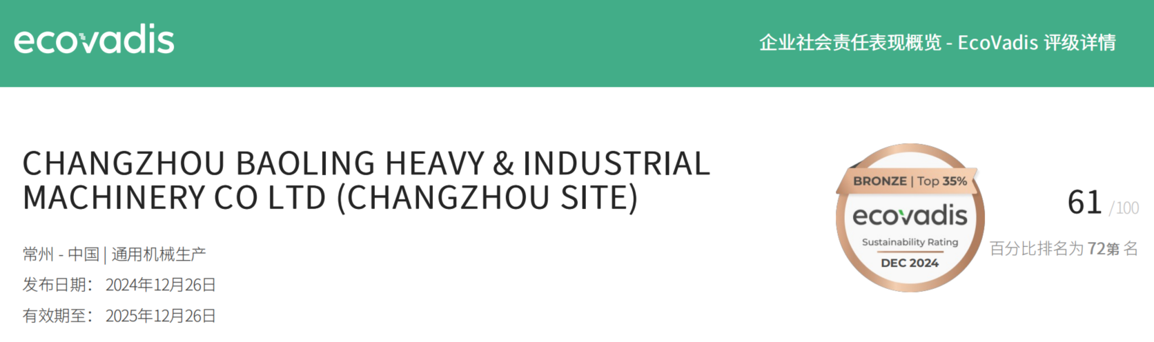 2024年12月26日,寶菱重工在EcoVadis企業(yè)社會責任評估中得分61分,并榮獲“銅牌”,在EcoVadis所有在評公司中躋身于前 35%(已超過 65% 以上的公司)。當前,“環(huán)境、社會責任和公司治理”(簡稱:ESG)水平已成為衡量企業(yè)長期價值和可持續(xù)發(fā)展能力的關(guān)鍵因素,其核心在于“友好環(huán)境、尊重員工、合規(guī)經(jīng)營、可持續(xù)發(fā)展”。公司將可持續(xù)發(fā)展理念融入企業(yè)戰(zhàn)略與日程經(jīng)營活動中,推動導入ESG